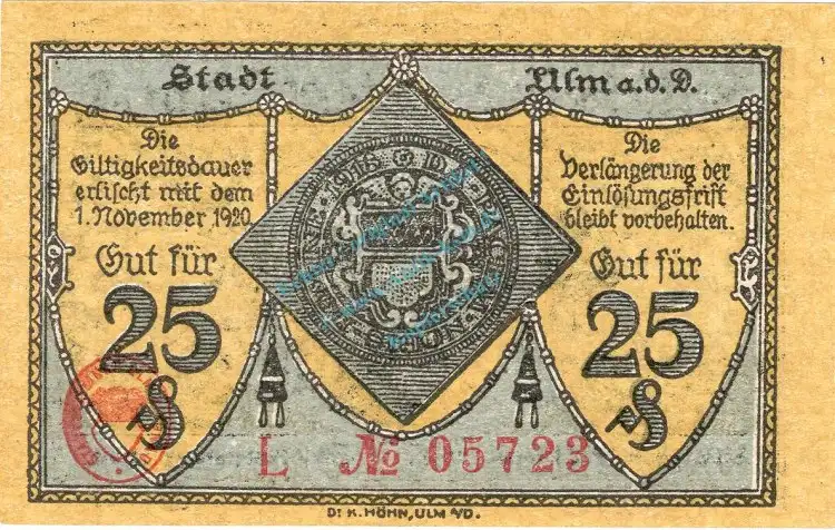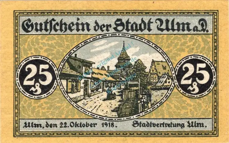 Ulm , Notgeld 25 Pfennig Schein unc-kfr. Ti.7520.10.01 , Württemberg 1918 Verkehrsausgabe