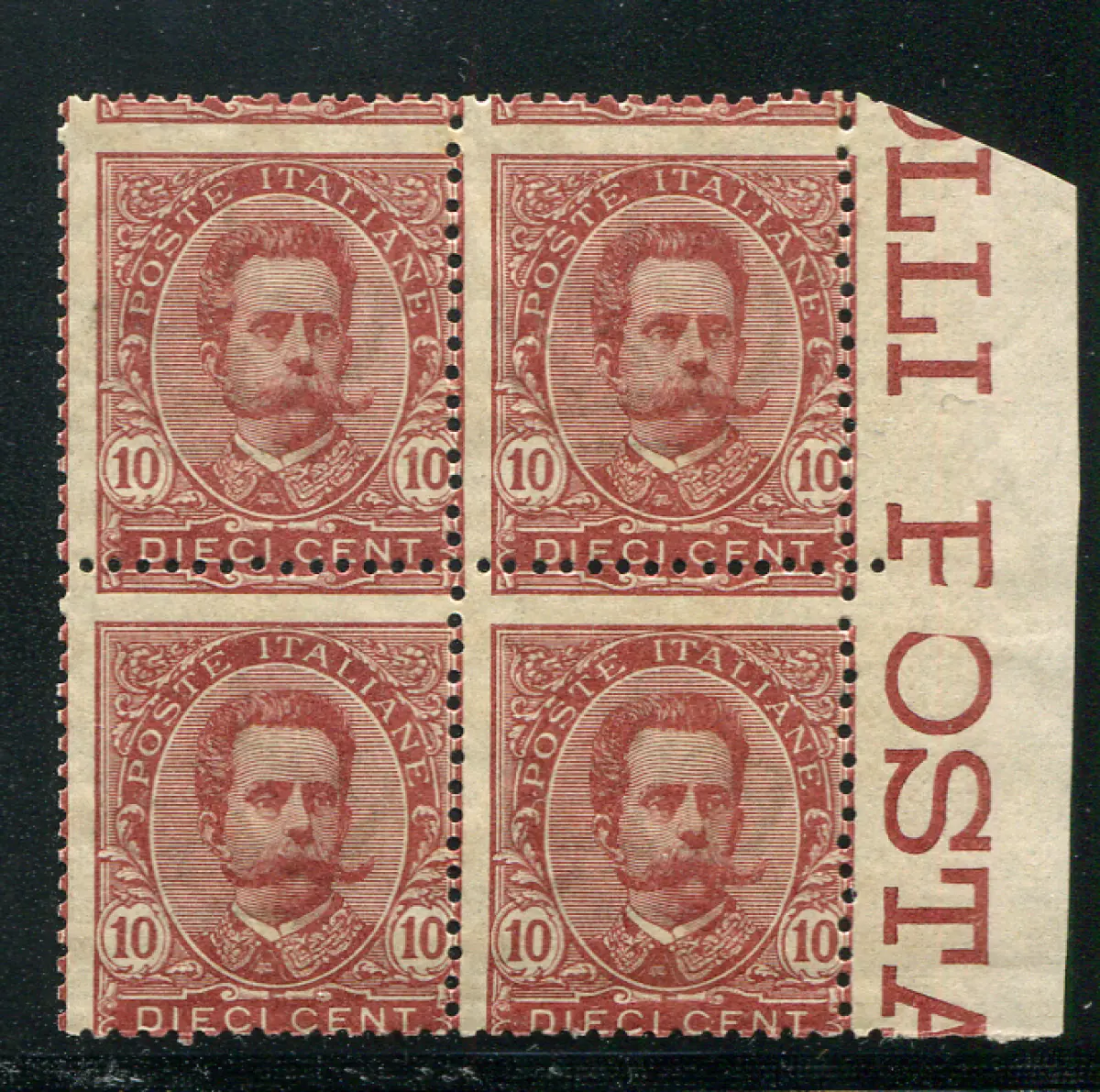 Umberto I. Cent. 10 Sorten verschobene Verzahnung Vollgummi - Umberto I. Cent. 10 Nr. 60 Quartina b. von f. mit stark nach oben verschobener horizontaler Verzahnung - Edle Sorte noch nicht katalogisiert (ev. n. 60ca) Cod. 90/13