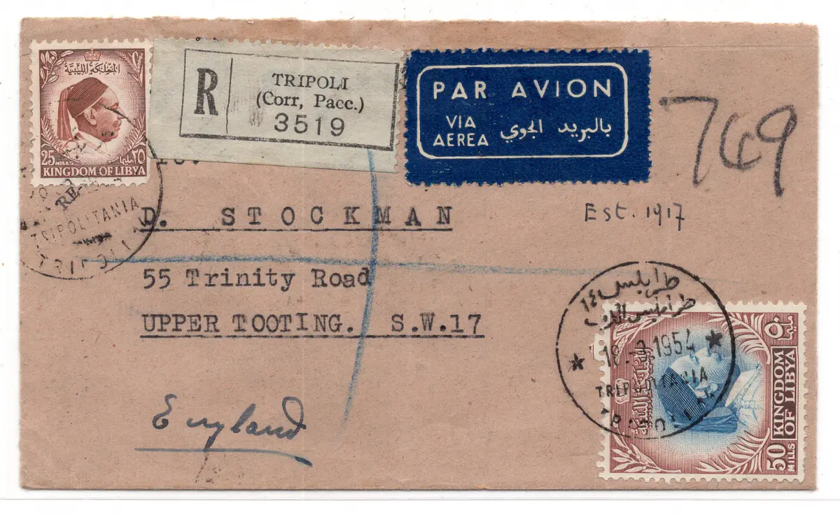 Umschlag - - Unabhängiges Libyen - König Idris 50 m. braun und hellblau Nr. 42 + Ergänzung Nr. 41 auf Einschreibenumschlag auf dem Luftweg nach Upper Tooting am 18.3.54 - Abfahrt zweisprachige Annullierung Tripolis 14 - an der interessanten Seite Luftaufkleber in französischer, italienischer und arabischer Sprache - Hochwertiger nicht philatelistischer Gebrauch Cod. 2538/WEB