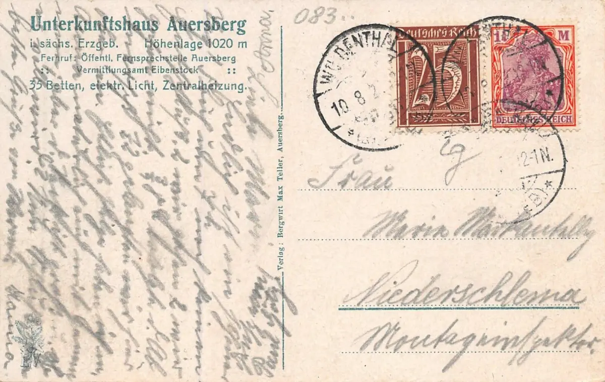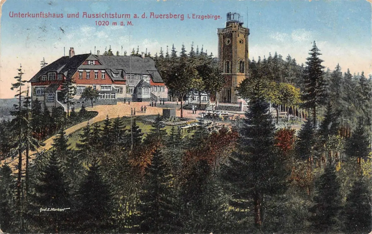 Unterkunftshaus und Aussichtsturm auf Auersberg Erzgebirge Sachsen AK 1922