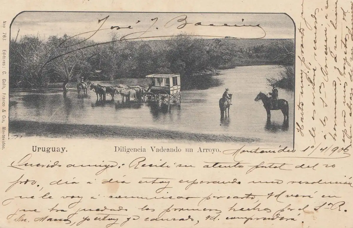 Uruguay 1906: post card MontevideoDiligencia Vadeando un Arroyo to Buenos Aires