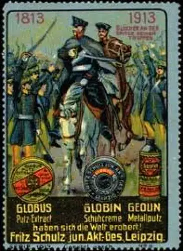 Globus Putz-Extract, Globin Schuhcreme, Geolin Metallputz haben sich die Welt erobert! Serie 1913, Bild No. 4, Befreiungskriege, Größe/Zustand: 7x5 , guter Zustand, Original alte Reklamemarke die seinerzeit für die Werbung benutzt wurde