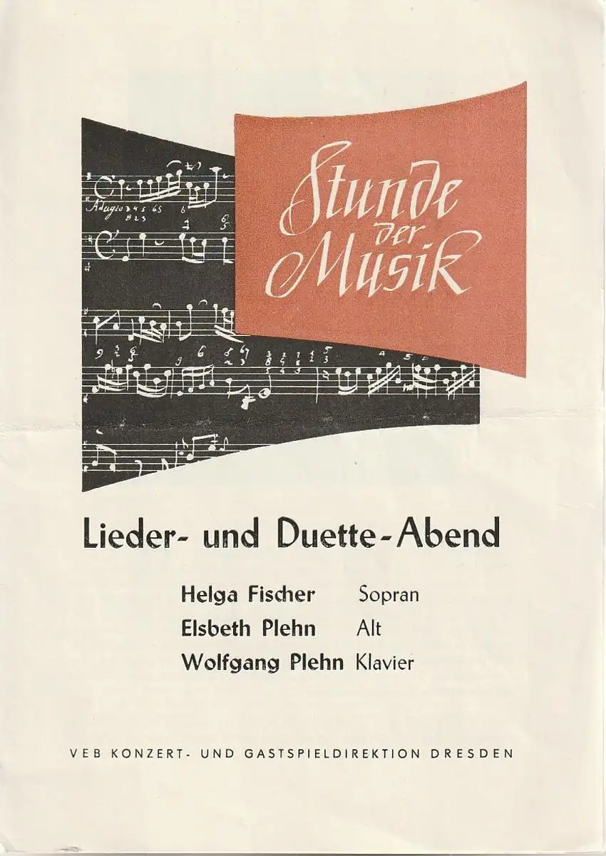 VEB Konzert- und Gastspieldirektion Dresden: Programmheft STUNDE DER MUSIK LIEDER- UND DUETTE-ABEND HELGA FISCHER / ELSBETH PLEHN / WOLGANG PLEHN ca. 1955.