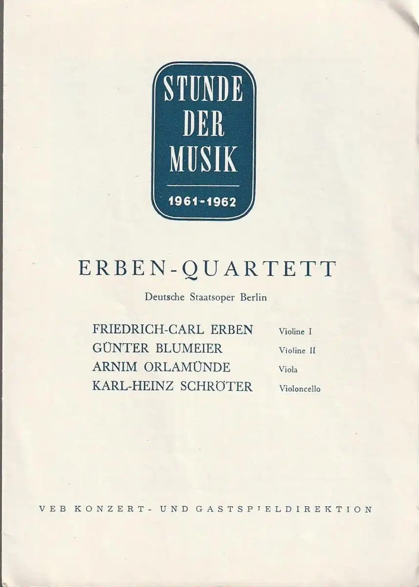 VEB Konzert- und Gastspieldirektion: Programmheft STUNDE DER MUSIK 1961 - 1962 ERBEN - QUARTETT.