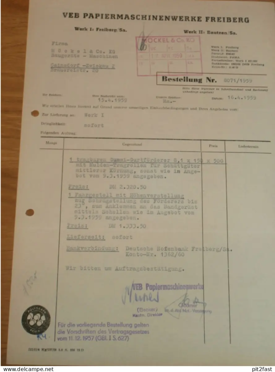 VEB Papiermaschinenwerke Freiberg , 1959 , Herr Glöckner , Herr Becker , Bautzen , altes Dokument , Reklame / Werbung !!