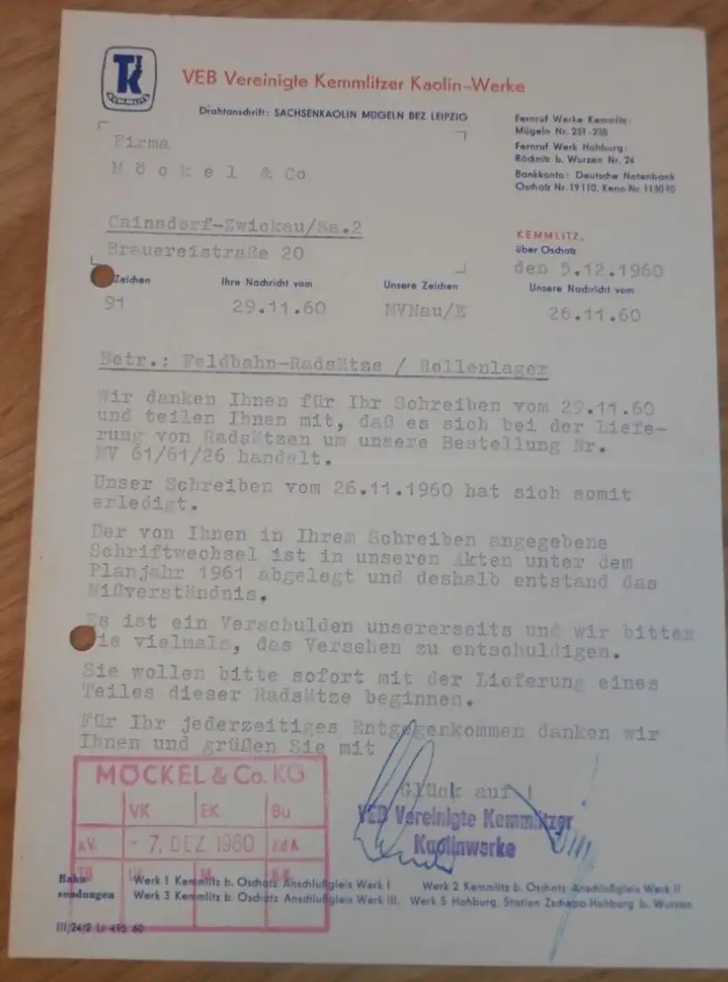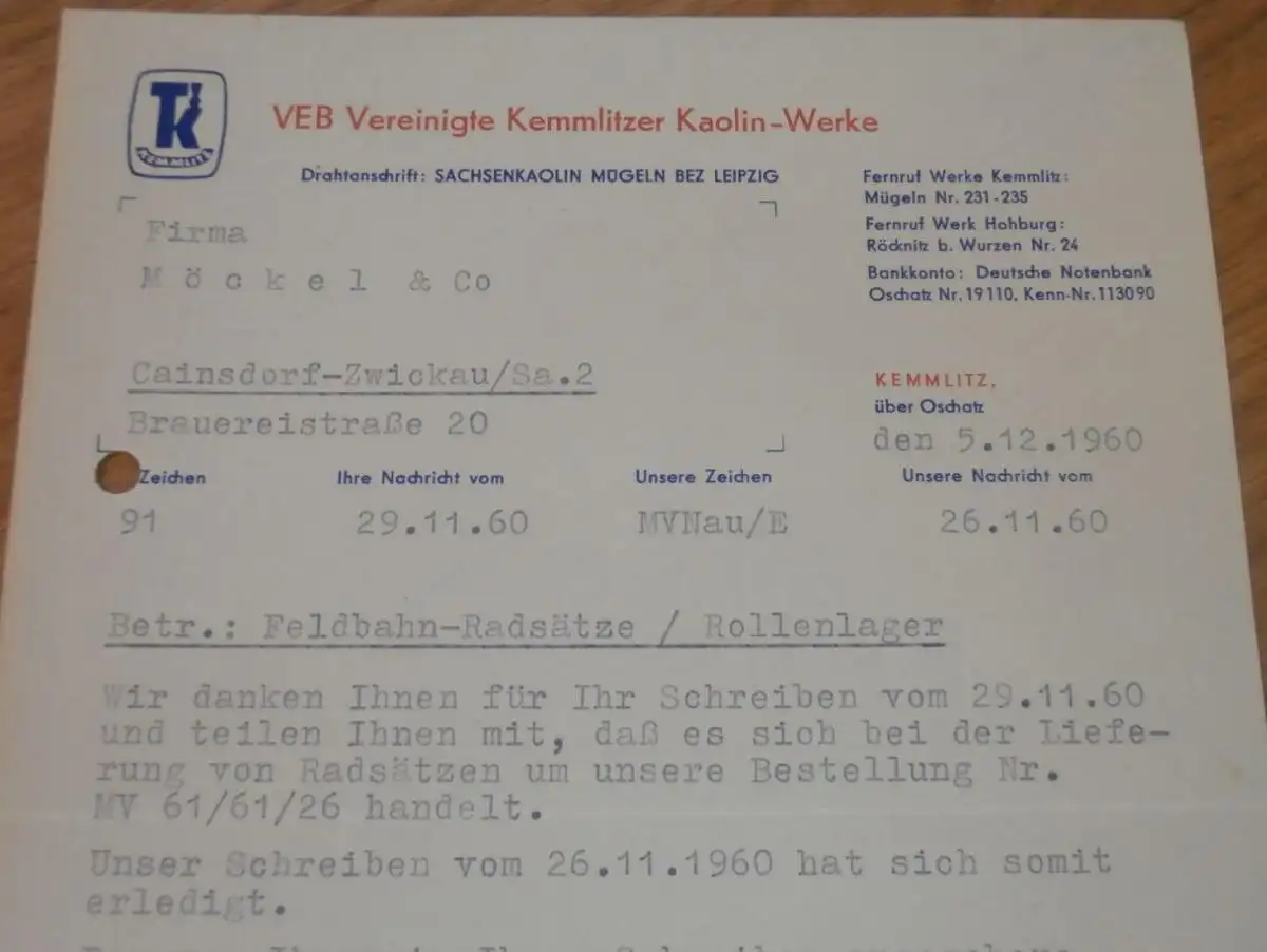 VEB Vereinigte Kaolinwerke in Kemmlitz b. Oschatz , 1960 , alte Rechnung , Reklame / Werbung !!AZ-WR/1k