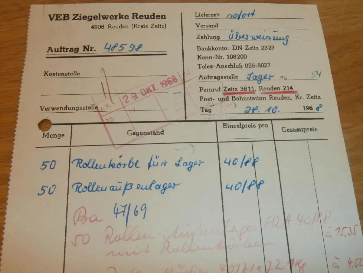 VEB Ziegelwerke Reuden b. Zeitz , 1968 , Hr. Krause , Hr. Kirsten , alte Rechnung , Reklame / Werbung !!