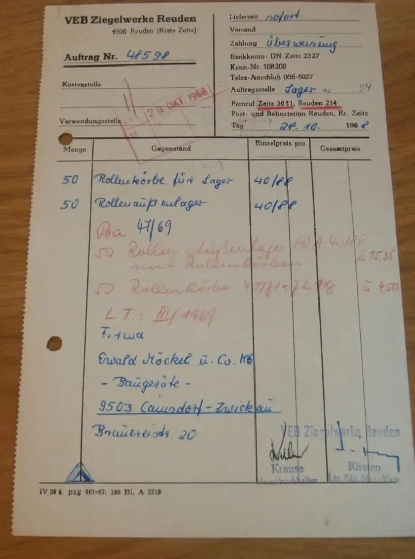 VEB Ziegelwerke Reuden b. Zeitz , 1968 , Hr. Krause , Hr. Kirsten , alte Rechnung , Reklame / Werbung !!AZ-WR/1k