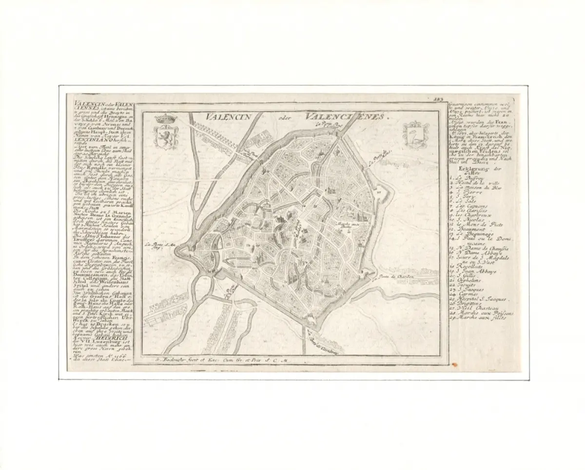 Valencin oder Valencienes [Valenciennes]. Befestigungsplan aus der Vogelschau. Original-Kupferstich, Bodenehr, Gabriel