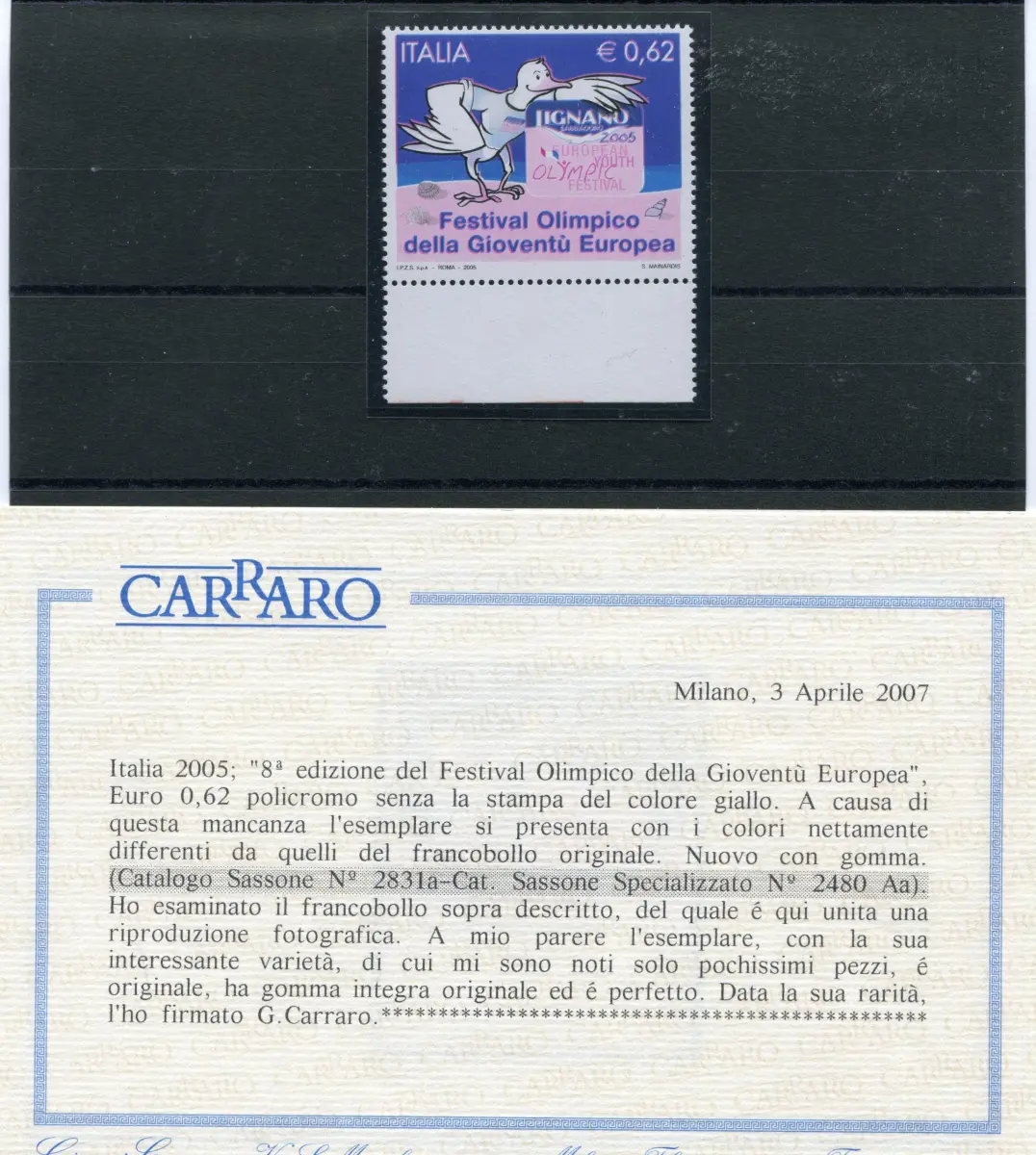Sorte Gelbe Möwe Vollgummi - MHN - - 2005 Olympisches Jugendfest Nr. 2831 wunderschönes Exemplar b. von f. ohne roten Farbdruck - Naturmarke Gelbe Möwe (Sass. spec. Nr. 2480 Ab) - Cert. Carraro - Kat. euro 6.000 Cod. 883/14