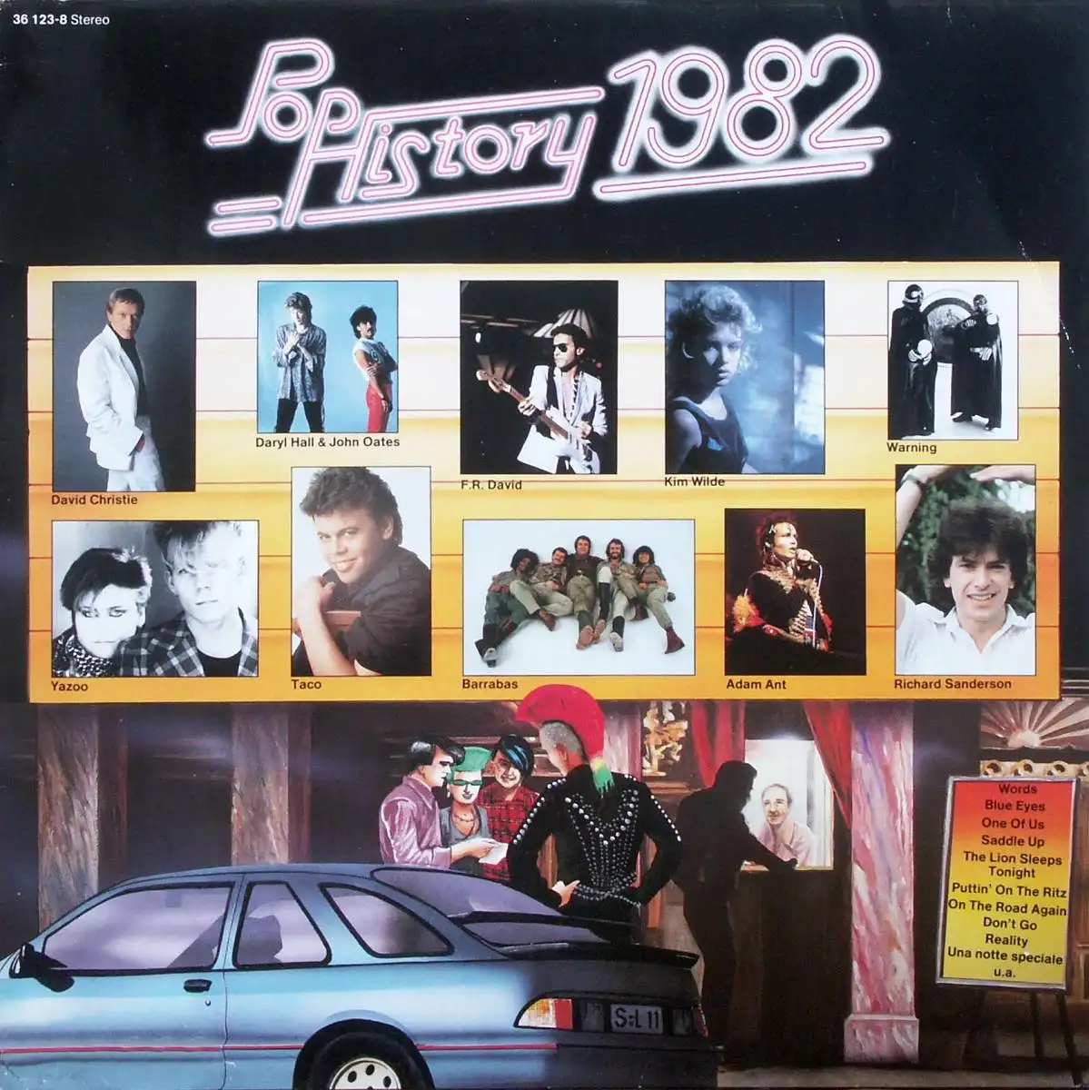 LP Album Various - Pop-History 1982, Zustand Platte VG+ Hülle VG; Made in Germany 1986 Sonocord 36 123-8, Tracks F.R. David - Words 3:33, Abba - One Of Us 3:55, Kim Wilde - Cambodia 3:56, David Christie - Saddle Up 5:45, Tight Fit - The Lion Sleeps Tonight 3:09, Alice - Una Notte Speciale 4:13, Yazoo - Don't Go 2:54, Barrabas - On The Road Again 4:30, Richard Sanderson - Reality 4:48, Adam Ant - Goody Two Shoes 3:28, Daryl Hall, John Oates - Maneater 4:24, Hot Chocolate - Girl Crazy 3:21, Elton John - Blue Eyes 3:25, Warning - Why Can The Bodies Fly 4:13, Dave Stewart - It's My Party 3:46, Taco - Puttin' On The Ritz 4:36