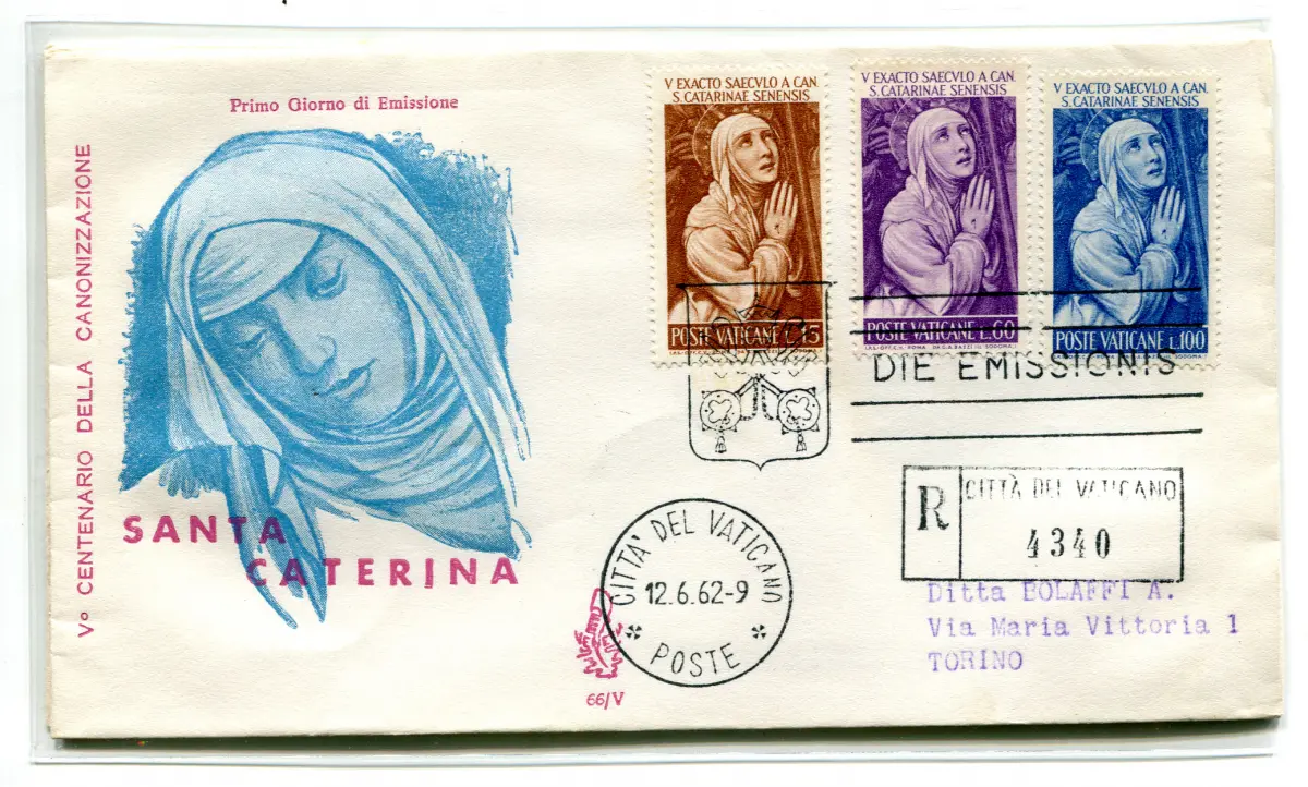 Vatikan FDC Venetia 1962 Santa Caterina voyata Racc. für Italien Vatikan 1962 Heilige Katharina auf Umschlag FDC gereist Racc. für Italien mit Annullierung der Ankunft - Abfahrt Cod. 1621/Venetia