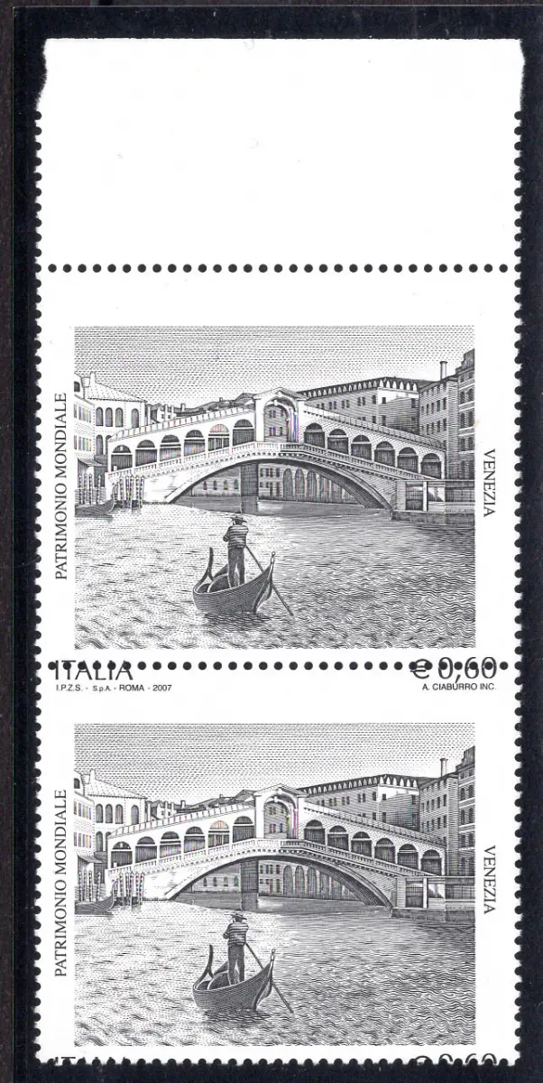 MNH - Vollgummi - Venedig UNESCO-Weltkulturerbe Euro 0,60 Nr. 2958b vertikales Paar b. von oben f. mit stark nach oben verschobener horizontaler Verzahnung - das praktisch fehlende obere Exemplar der Schrift Italien Euro 0,60 Cod. 955/17
