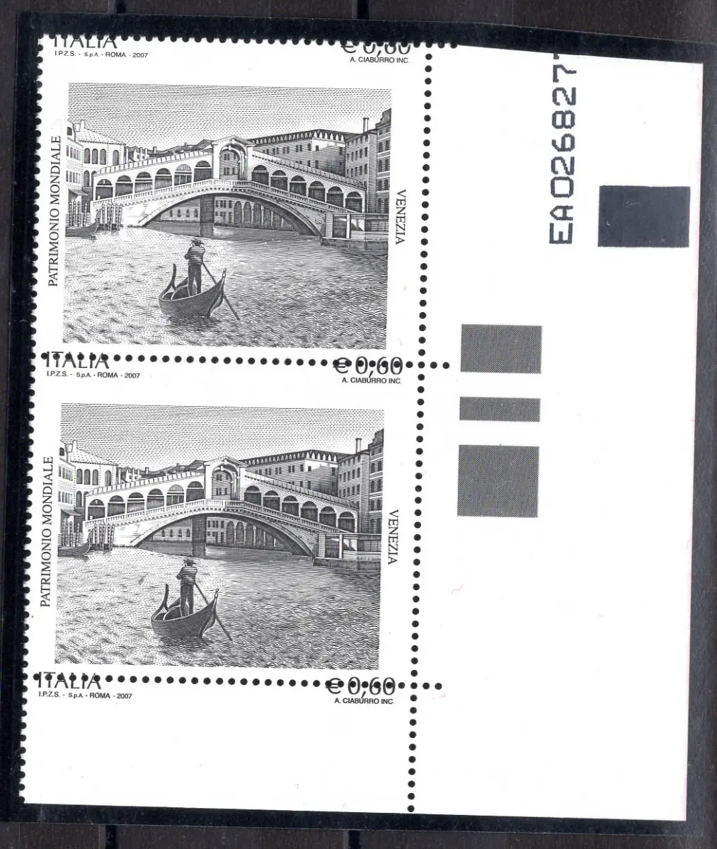 MNH - Vollgummi - Venedig UNESCO-Weltkulturerbe Nr. 2958b vertikales Paar mit stark nach oben verschobener horizontaler Verzahnung - das untere Exemplar mit der Aufschrift I.P.Z.S.. am Blattrand wiederholt - Uncommon Cod. 954/17
