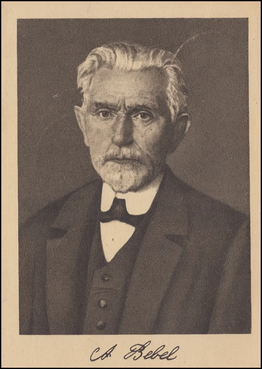 roter Sonderstempel "BERLIN NW 7 Vereinigungsparteitag der Sozialdemokratischen Partei Deutschlands und der Kommunistischen Partei Deutschlands 21./22. April 1946" und Sonderstempel "BERLIN NW 7 Parteitag der Sozialdemokratischen Partei Deutschlands 19.-20. April 1946", auf Ansichtskarte August Bebel