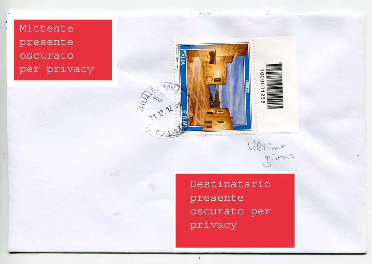 Verezzi mit Barcode isoliert auf Umschlag Umschlag - Verezzi mit Barcode isoliert auf Umschlag von Rom nach Stadt am 31.12.12 - Letzter Tag des Tarifs von 0,60. Uncommon Cod. 419/WEB Cod. 419/WEB