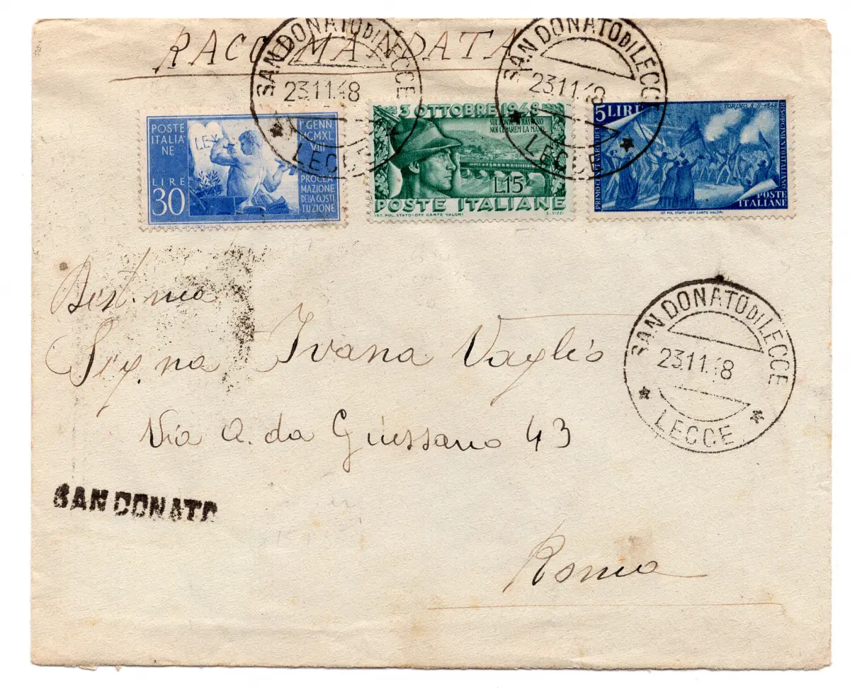 Umschlag - Verfassung Lire 30 Nr. 579 + Ergänzungen Nr. 582 + 592 auf Umschlag Racc. am 23.11.48 - Schön und ungewöhnlich, im Tarif - Kat. euro 220 Cod. 277/17