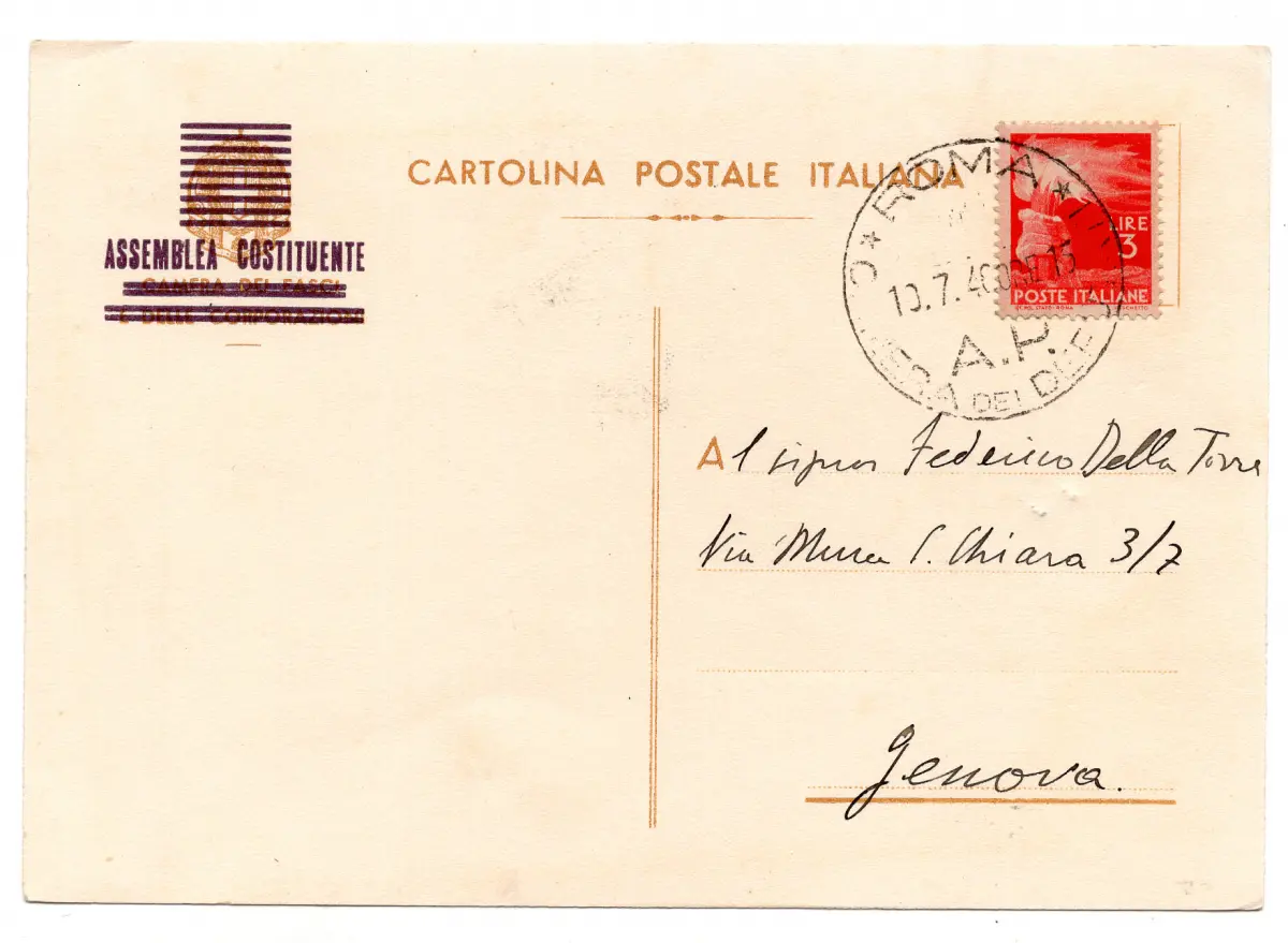 Postkarte - Verfassungsgebende Versammlung - Frankierte Postkarte mit 3 Lire Demokratica Nr. 553 gereist nach Genua am 10.7.46 - Abfahrt Jahr. Abgeordnetenhaus - Die Postkarte hieß Bündel- und Zunftkammer und wurde mit violettem Stempel überdruckt - Ungewöhnlich Cod. 258/17