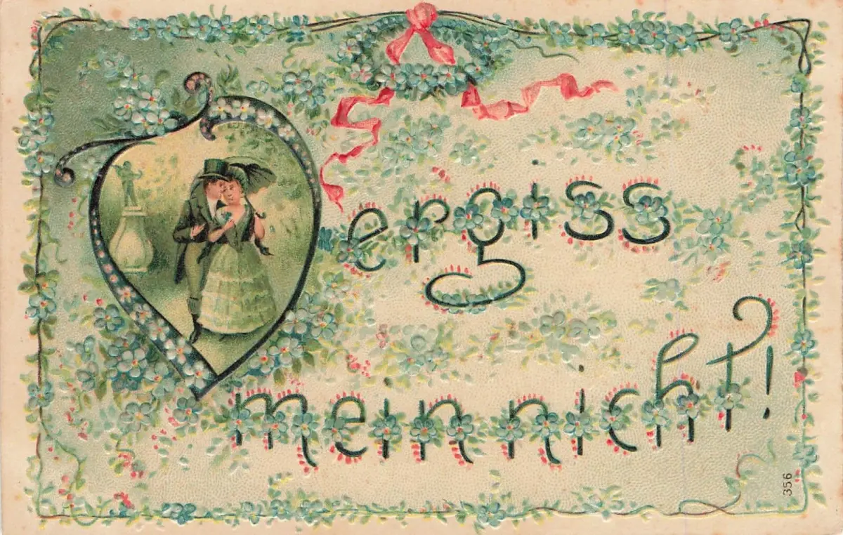 Vergiss mein nicht! Mann Anzug Zylinder Frau Kleid grün Postkarte AK