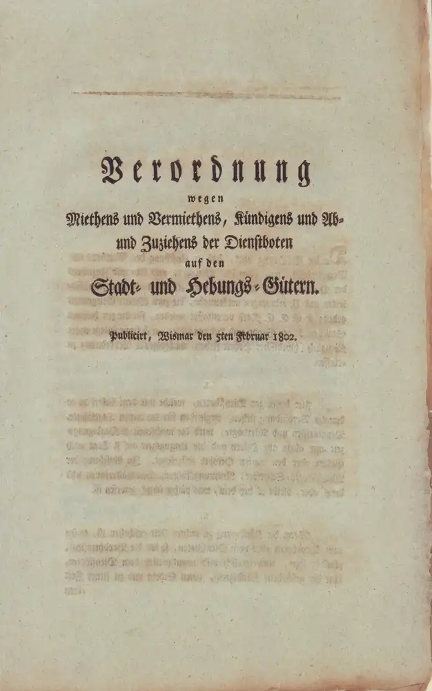 Verordnung wegen Miethens und Vermiethens, Kündigens und Ab- und Zuziehens der Dienstboten auf den Stadt- und Hebungs-Gütern. Publicirt, Wismar den 5ten Februar 1802.