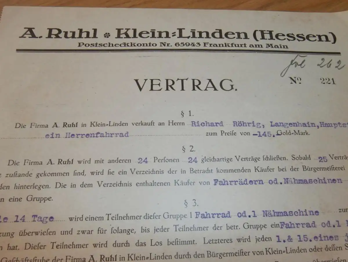 Vertrag für Fahrrad , 1925 , Richard Röhrig in Langenhain b. Hofheim a. Taunus , Fa. Ruhl in Kleinlinden b. Gießen !!