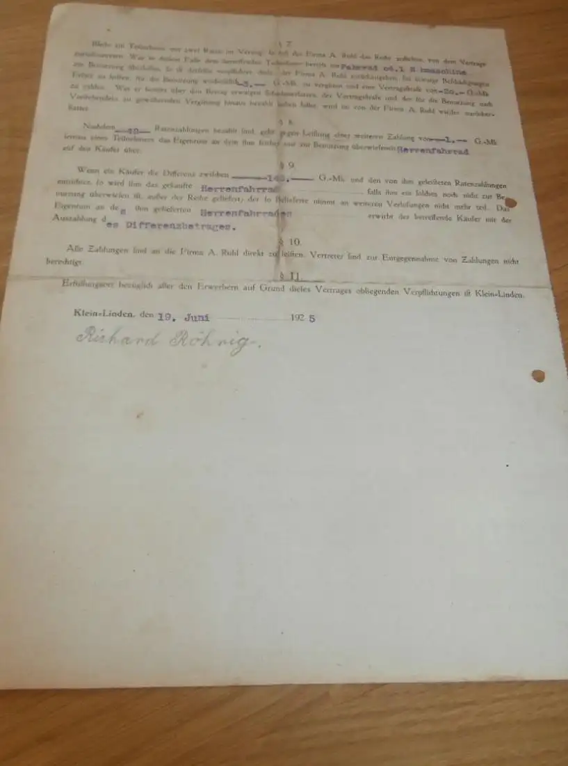 Vertrag für Fahrrad , 1925 , Richard Röhrig in Langenhain b. Hofheim a. Taunus , Fa. Ruhl in Kleinlinden b. Gießen !!AZ9-V