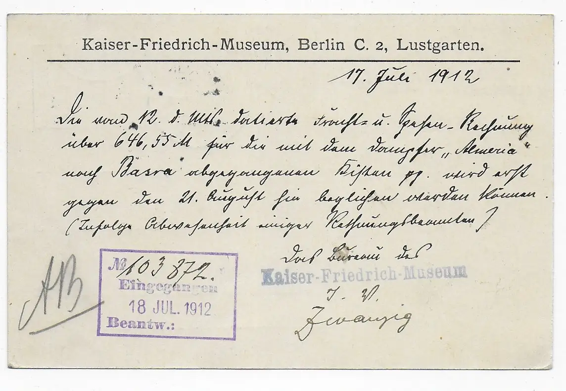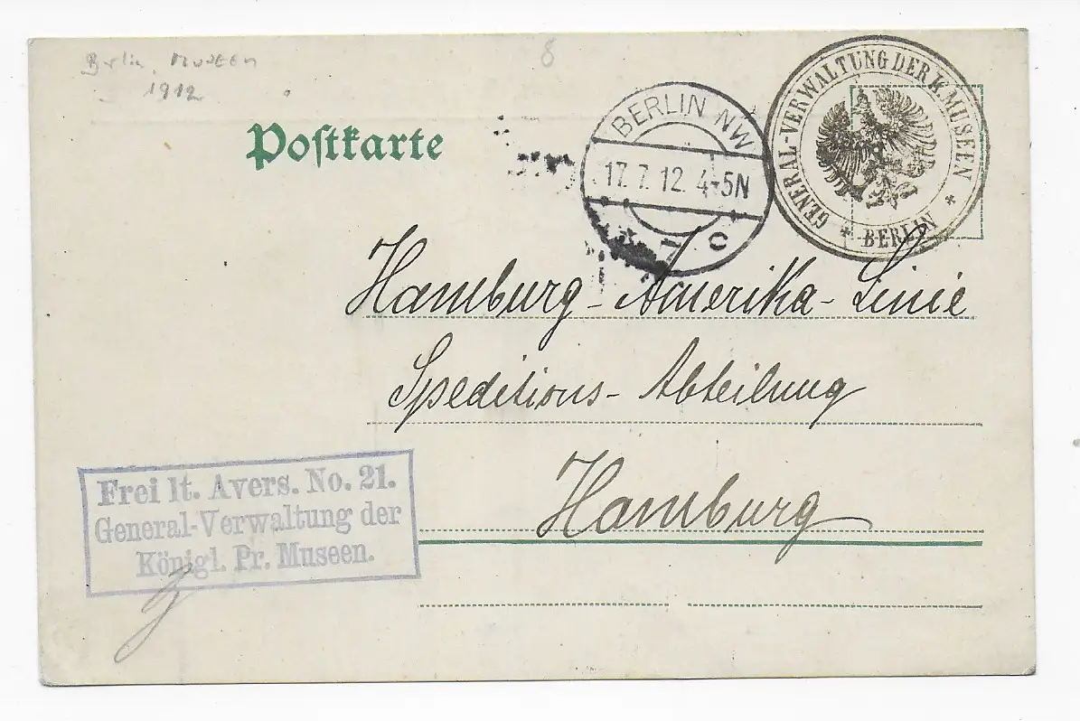 Verwaltung der Museen Berlin, 1912 an Spedition Amerika Linie Hamburg