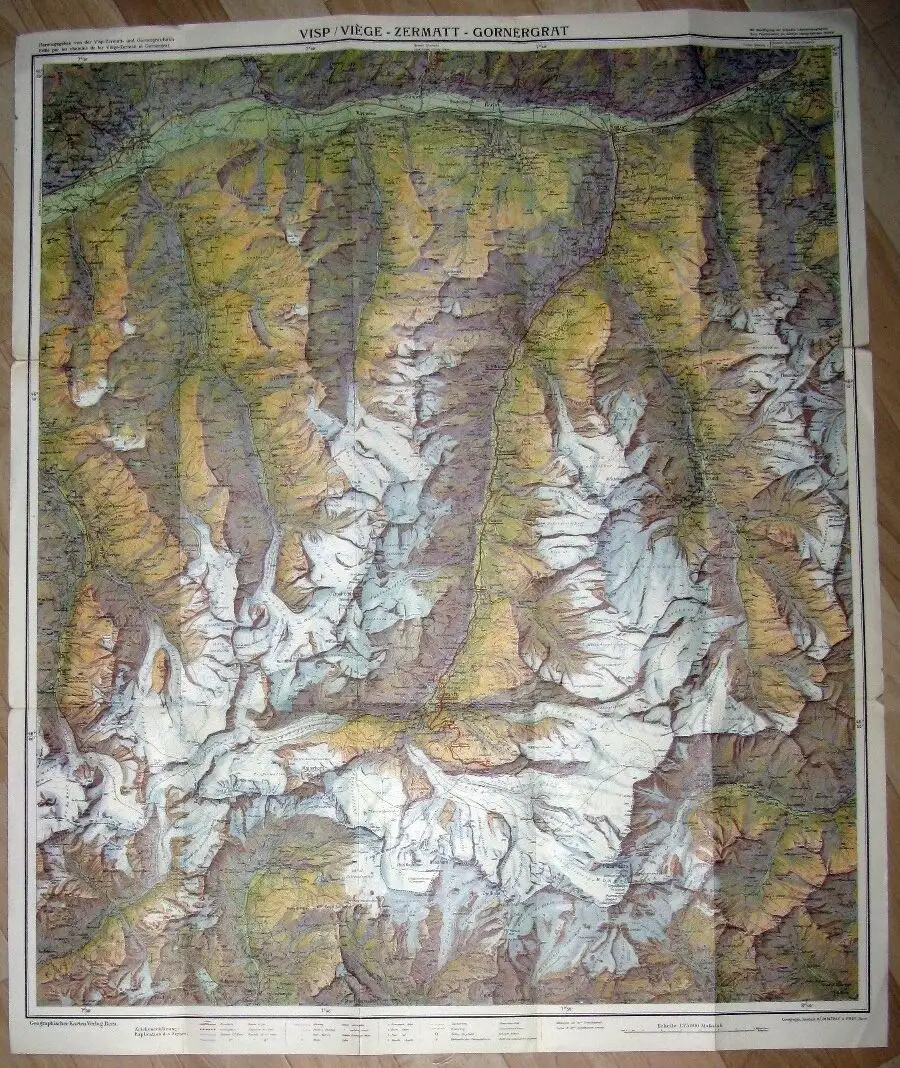 guter Zustand, geringe Gebrauchs- und Alterungsspuren: Ränder und Ecken teils mit kleinen Blessuren, teils etwas eselsohrig - oberer Querfalz rechts und links bis ca. 3 cm und der untere Falz rechts bis 1 cm sowie links minimal eingerissen - Falzkreuze teils gering aufgerissen, zur Datierung: das Deckelbild von Dan Buzzi ist auf 1926 datiert Maßstab: 1:75.000 hergestellt bei Kümmerly & Frey in Bern in deutscher und französischer Sprache, Papier, ca. 12,5 x 25,5 (aufgeklappt ca. 62,5 x 76,5), 17 Seiten (Vorder- und Rückseite sowie 15 Seiten Karte)