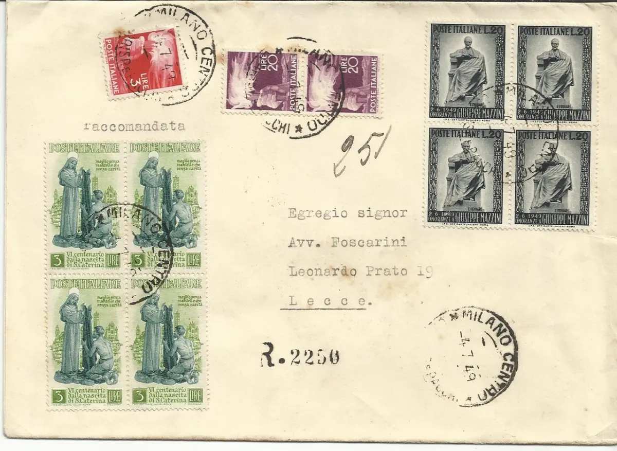 Mazzini Quartina + Ergänzungen auf Tarifumschlag drei Häfen - Mazzini Nr. 604 Quartina + Ergänzungen Nr. 553 + 561 x 2 + 574 x 4 auf Umschlag Racc. exp. von Mailand nach Lecco am 4.7.49 - im Tarif drei Häfen - Interessant auch für die Verwendung von Zwillingswerten Code 238/7