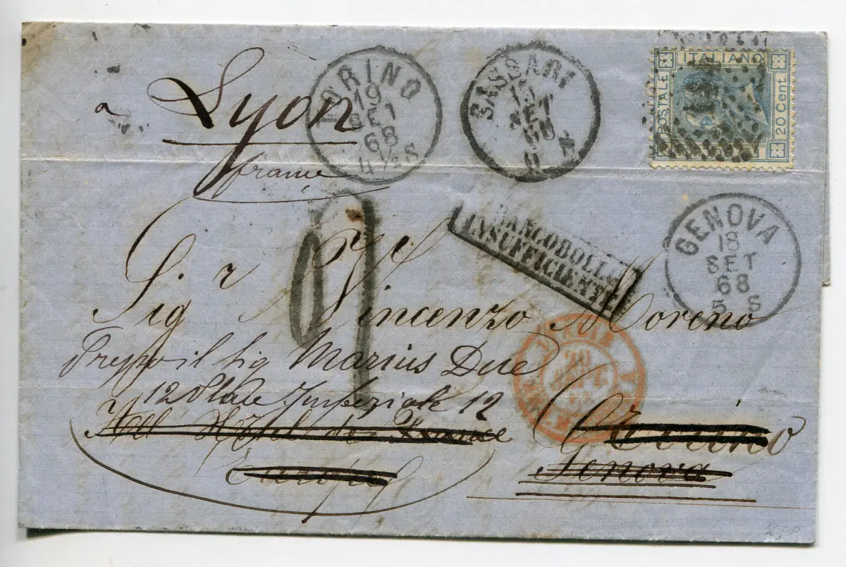 Vitt. Emanuele II. Bigola - Brief auf dem Seeweg - besteuerter Umschlag - Brief von Sassari am 15.1868 nach Genua, von hier am 19.9.68 nach Turin zurückgeschickt und wieder nach Lyon verschickt - neben der Ann. im Ordner Unzureichende Briefmarke und Steuerzeichen - auf dem Brief befinden sich alle Transit- und Ankunftsstornierungen - Interessant - Nr. 1007/OUTLET