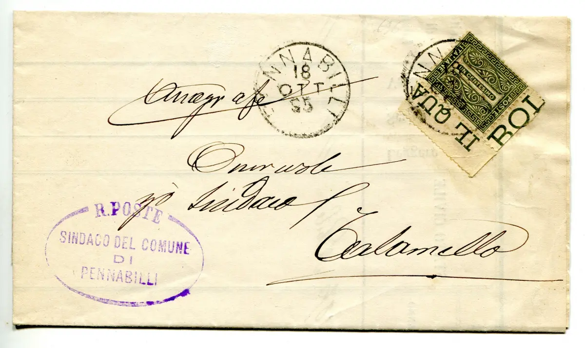 Vitt. Emanuele II Cent. 1 T14 Bogenwinkel auf Falz Vitt. Emanuele II Cent. 1 Nr. T14 isolierter Bogenwinkel auf Falz von Pennabilli nach Talamello am 18.10.1895 - Ungewöhnlich für den Spezialisten Cod. 28/A