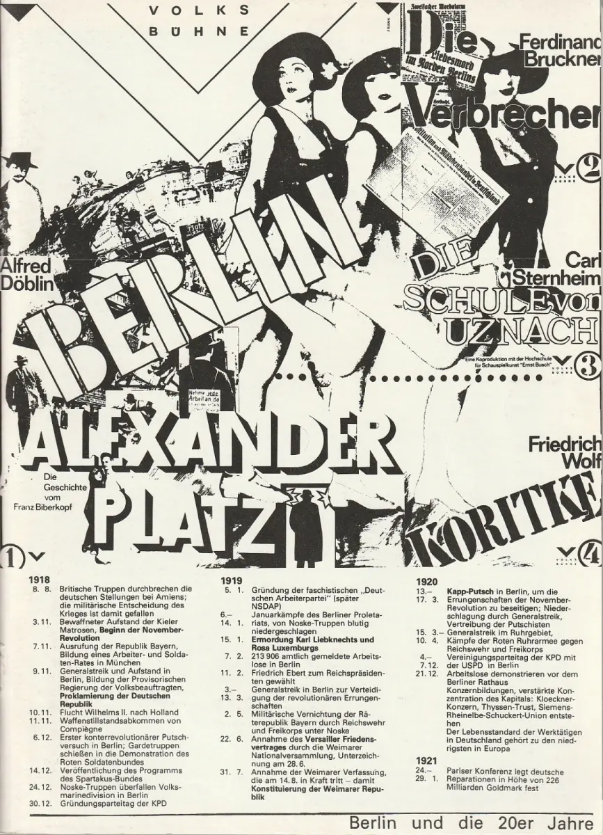Die Geschichte vom Franz Biberkopf. Entwurf für eine Theateraufführung von Bärbel Jaksch und Heiner Maaß. Regiefassung der Volksbühne. RH Helmut Straßburger / Ernstgeorg Hering. Bühne: Jochen Finke. Mitarbeit: Werner Lorenz. Kostüme: Christiane Kunze / Jutta Harnisch. Musik: Rainer Böhm, Bernd Wefelmeyer. Choreographie: Detlef Völker. Mitwirkende: Günter Junghans, Klaus Mertens, Gisela Rubbel, Winfried Wagner, Klaus Piontek, Hildegard Alex, Monika Plötner, u.a. - Theaterprogramm, Opernprogramm, Ballettprogramm, Musicalprogramm, Konzertprogramm, Theatermemorabilia, Programmhefte Sammlung, deutsche Theatergeschichte.