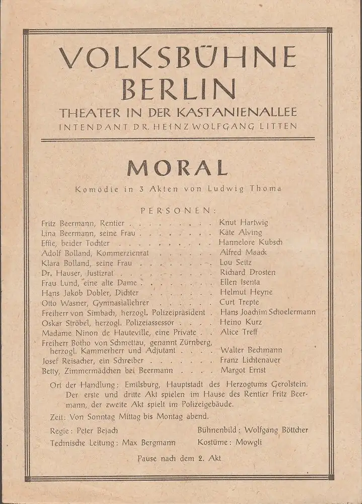 Volksbühne Berlin, Heinz Wolfgang Litten: Theaterzettel Ludwig Thoma MORAL 1948 Theater in der Kastanienallee.