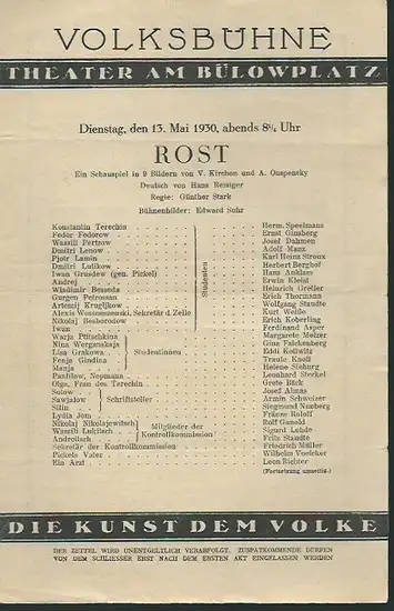 Titel: Programmheft zu 'Rost', ein Schauspiel in 9 Bildern von V. Kirchon und A. Ouspensky. Deutsch von Hans Reisiger. Regie: Günther Stark. Bühnenbilder: Edward Suhr. Mitwirkende: Ernst Ginsberg, Josef Dahmen, Karl Heinz Stroux, Wolfgang Staudte, Margarete Melzer, Gina Falckenberg, Traute Knoll, Leonhard Steckel, Josef Almas u.v.a. Aufführung in 'Volksbühne', Theater am Bülowplatz, Berlin am 13. Mai 1930. Mit Einführung