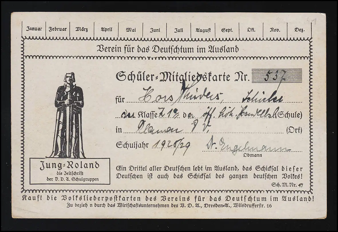 Karte des Vereins für das Deutschtum im Ausland, Motiv der Volksliederkarte Nr. 47 des Künstlers Paul Hey "Nun leb wohl du kleine Gasse, Nun ade du stilles Dach!", Rückseite mit ausgefülltem Bestellformular /Schüler Mitgliedskarte für den Jung-Roland, die Zeitschrift der D.D.U. Schulgruppen. Verein für das Deutschtum im Ausland (VDA). Ausgefüllt 1928