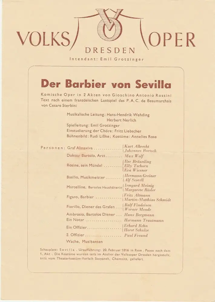 Komische Oper von Gioachino Antonio Rossini. Musikalische Leitung: Hans-Hendrik Wehding / Herbert Nerlich. Spielleitung: Emil Grotzinger. Bühne: Rudi Lißke. Kostüme: Annelies Rose. Mitwirkende: Kurt Albrecht / Johannes Bartsch, Max Wolf, Ilse Bräunling / Elly Tschorn / Eva Wiesner, Hermann Greiner / Alf Scorell, Irmgard Meinig / Margarete Rösler, Fritz Altmann / Martin-Matthias Schmidt, Ralf Findeisen / Werner Mende, Hans Bergmann, Hermann Trautmann, Erhard Rehn / Horst Schulze, Paul Freund - Theaterprogramm, Opernprogramm, Ballettprogramm, Musicalprogramm, Konzertprogramm, Theatermemorabilia, Programmhefte Sammlung, deutsche Theatergeschichte.