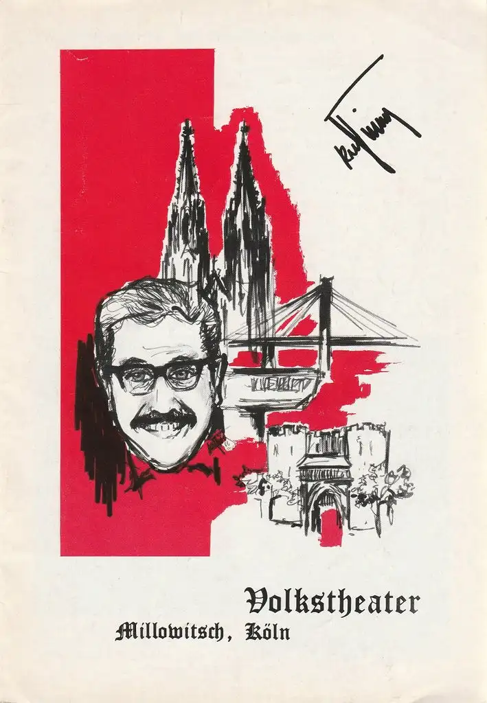 original Heft, nicht paginiert, ca. 24 Seiten, diverse Fotos ( Willy Millowitsch u.a. mit: Peter Alexander, Loni Kellner, Peter Frankenfeld, Hans-Jürgen Bäumler, Heidi Kabel, Fernandel, das neurenovierte Theater ), beiliegende Besetzungsliste. Zustand: gut, Besetzungsliste mit kleinen Läsuren am rechten Rand