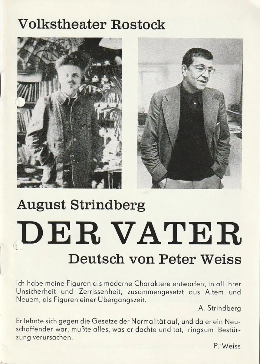 ( Fadren ). Trauerspiel in drei Akten. Deutsch von Peter Weiss. DDR-Erstaufführung der Übersetzung am 15. Dezember 1984 im Intimen Theater. Inszenierung: Sylvia Richter. Ausstattung: Wolfgang Flesch. Mitwirkende: Gerd Micheel, Renate Köhn, Karin Mikityla, Karl-Heinz Fischer, Erich Altrock, Annelise Matschulat, Hans-Jürgen Kühnert, Wolfgang Hellwig - Theaterprogramm, Opernprogramm, Ballettprogramm, Musicalprogramm, Konzertprogramm, Theatermemorabilia, Programmhefte Sammlung, deutsche Theatergeschichte.