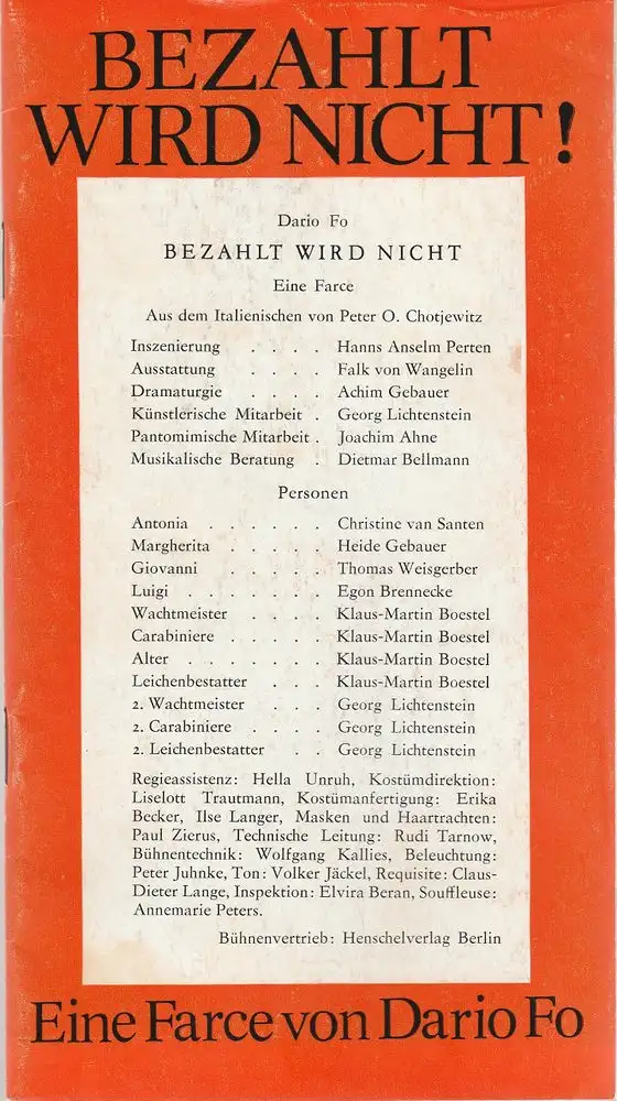 Volkstheater Rostock, Hanns Anselm Perten, Achim Gebauer, Georg Hülße: Programmheft Dario Fo BEZAHLT WIRD NICHT Spielzeit 1978 / 79.