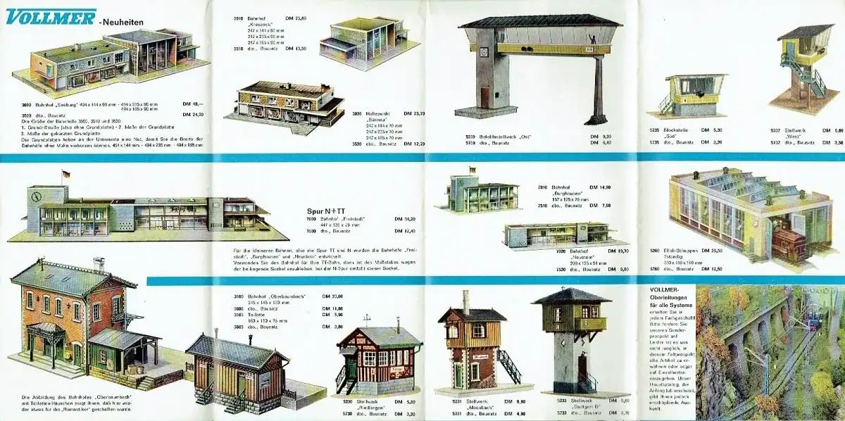 Prospekt mit Angeboten an Zubehör (Gebäude, Brücken etc.) für Modelleisenbahn und deren Preisen
