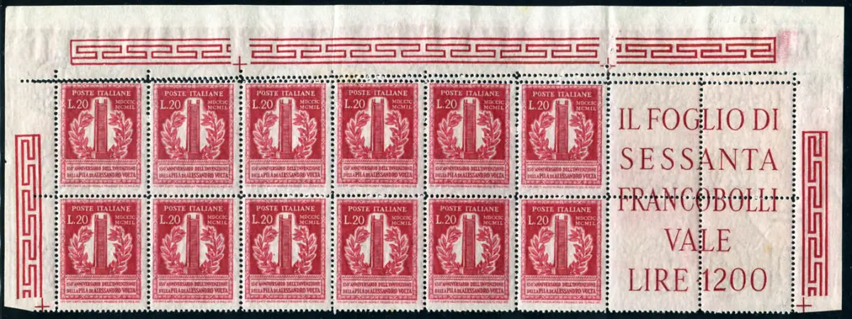 Volta Lire 20 Sorten doppelte horizontale Verzahnung Vollgummi - Volta Lire 20 Nr. 611g Block von zwölf Exemplaren (Blattoberteil) mit doppelter horizontaler Verzahnung auf sechs oberen Exemplaren - Schönes Set - Kat. 1.500 Euro + Code 440/8