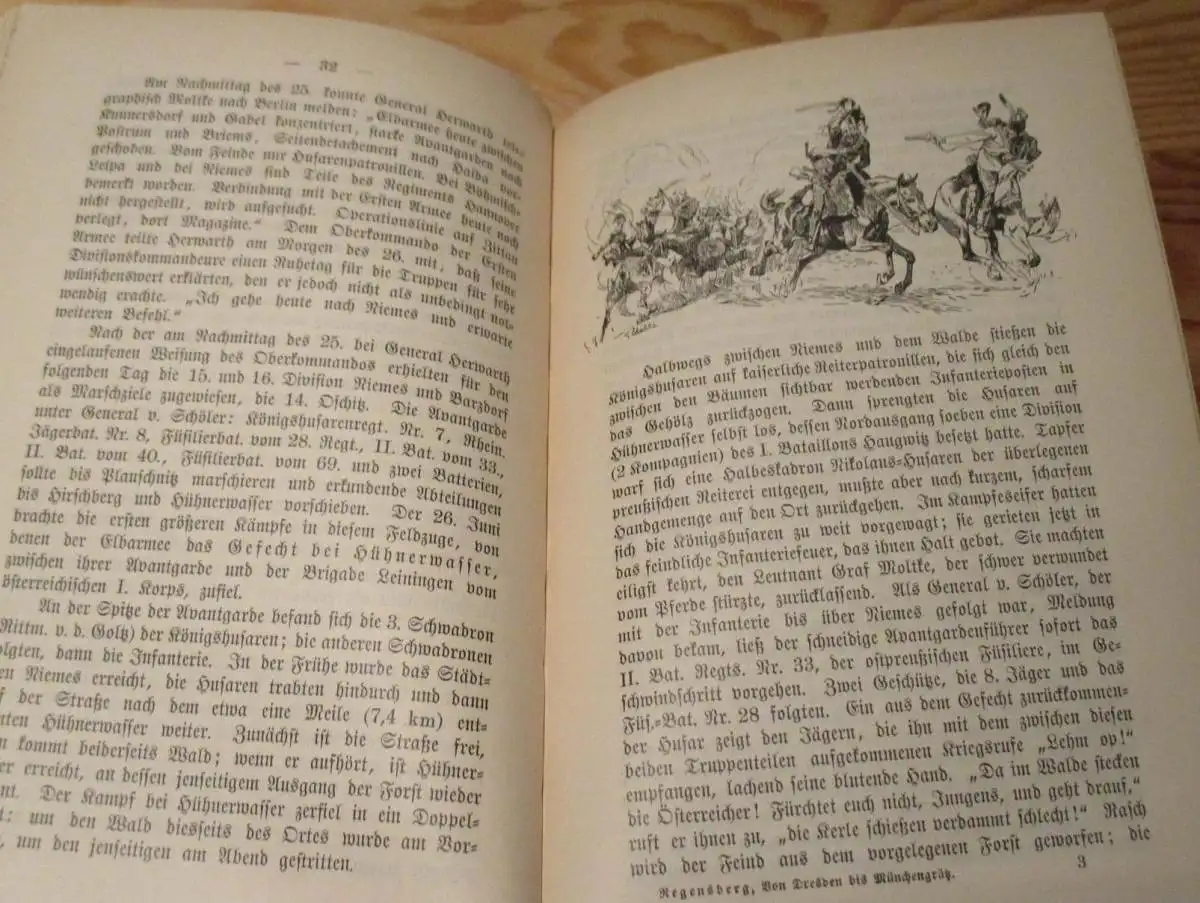 Gefecht bei Liebenau am 25. Juni 1866, Gefecht bei Hühnerwasser am 26. Juni 1866, Gefecht bei Podol am 26. und 27. Juni 1866, Schlacht bei Münchengrätz am 28. Juni 1866 (Inhalt)REGENSBERG 1866. In dem heißen Sommer 1866 ward auf den blutigen Schlachtfeldern Westdeutschlands und Böhmens das lange Ringen und Mühen der beiden Mächte Preußen und Österreich um die Führerschaft in Deutschland zum Austrag gebracht. Den siebentägigen Krieg hat man jenen an überraschenden Wechselfällen und interessanten Episoden so reichen Feldzug genannt, in dem Preußens Heer zur Überraschung aller Welt den Sieg davontrug. Dies geschah, trotzdem die Österreicher den alten Ruf ihrer Tapferkeit aufs neue glänzend bewährten und ihre Armee bei Custoza und Trautenau, wie ihre Marine bei Lissa die schwarzgelben Banner mit neuen Lorbeeren schmückten. Aus den Gegnern von damals sind seit 1879 wieder Freunde geworden, die treu festhalten an dem Bündnis, das Kaiser Wilhelm II. in seiner ersten Thronrede als ein Vermächtnis der deutschen Geschichte, dessen Inhalt heute von der öffentlichen Meinung des gesamten deutschen Volkes getragen wird, bezeichnete. Wer die Großtate, die Deutschlands tapfere Scharen im Kampfe gegen das zweite Kaiserreich und die dritte Republik vollbrachten, recht würdigen und verstehen will, dem müssen unbedingt auch die Geschehnisse von 1866 genau bekannt sein. Daß aber das Wissen vom deutschen Bruderkrieg zumal bei der jüngeren Generation - vielfach recht oberflächlich und lückenhaft ist, kann man leider häufig genug wahrnehmen. Es mangelte eben immer noch an einer im guten Sinne populären Darstellung dieses Krieges, die allen Ansprüchen genügen könnte. In der ersten Zeit würden dergleichen Schilderungen zu peinliche Erinnerungen erweckt haben; viele für den Geschichtschreiber wichtige Vorgänge und Umstände blieben auch noch in Dunkel gehüllt, das nicht einmal die sonst so vortrefflichen Arbeiten des preußischen wie des österreichischen Generalstabes zu lichten für angebracht hielten. Erst neuerdings ist durch die epochemachenden Werke von H. Friedjung, O. v. Lettow-Vorbeck u. a., durch die Denkwürdigkeiten von Bismarck, Stosch, Blumenthal, Govone, Hohenlohe usw. in den Hauptsachen Klarheit geschaffen worden. Damit ist nun auch die Zeit gekommen für eine volkstümliche Schilderung jenes kurzen und doch so folgenschweren Kriege, die sich die Aufgabe stellt, sämtliche Ergebnisse jener neuesten Forschungen und Enthüllungen den weitesten Kreisen zu übermitteln. Fr. Regenbergs Einzeldarstellungen der wichtigsten Begebenheiten von 1866 sind keineswegs für den Militär allein berechnet, sondern wenden sich in ihrer unterhaltenden Form an jedermann in Deutschland ebensogut wie in Österreich-Ungarn. In anschaulicher, übersichtlicher und lebendiger Darstellung führen die einzelnen Bände die Hauptmomente des Feldzuges vor. Der Verfasser ist redlich bemüht gewesen, Licht und Schatten gleichmäßig zu verteilen und alle Vorgänge mit größter Objektivität zu schildern. Grundsätzlich hat er von seiner Darstellung alles ausgeschlossen, was nicht historisch zu erweisen und durch authentische Veröffentlichungen beider Teile zu erhärten ist, alles auf bloßer Phantasie oder Kombinationen beruhenden Schilderungen, die nur falsche oder tendenziös gefärbte Anschauungen hervorzurufen vermögen. Namentlich den noch lebenden Mitkämpfern in Deutschland und Österreich-Ungarn, wie allen Zeitgenossen des sechsundsechziger Krieges werden diese mit Illustrationen und Karten schön ausgestatteten Bände zweifellos das lebhafte Interesse einflößen. (Verlagstext 1903 - W. Keller & Co. Stuttgart)