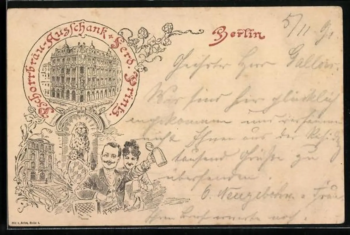 Vorläufer-AK Berlin, 1891, Pschorrbräu-Ausschank, Friedrichsstrasse Ecke Behrenstrasse, Ferd. Prinz, Ganzsache