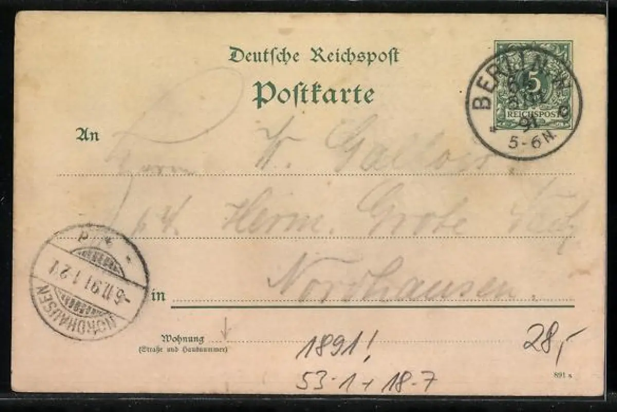 gelaufen 1891, Eckknicke li. und oben, guter Zustand