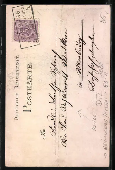 alte Ansichtskarte, gelaufen 1888, vertikaler Mittelbug, guter Zustand