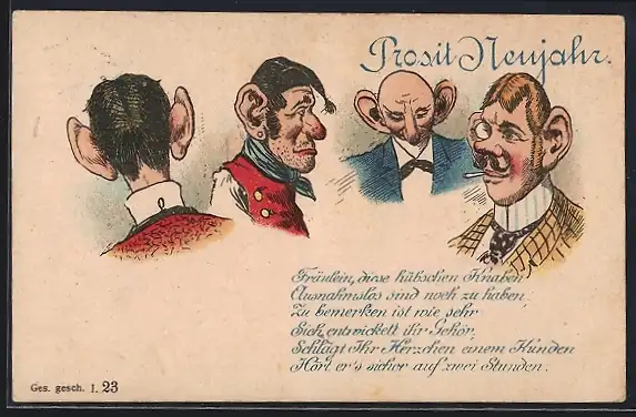 Vorläufer-AK Männer mit riesigen Segelohren, 1895, Neujahrsgruss an Damen