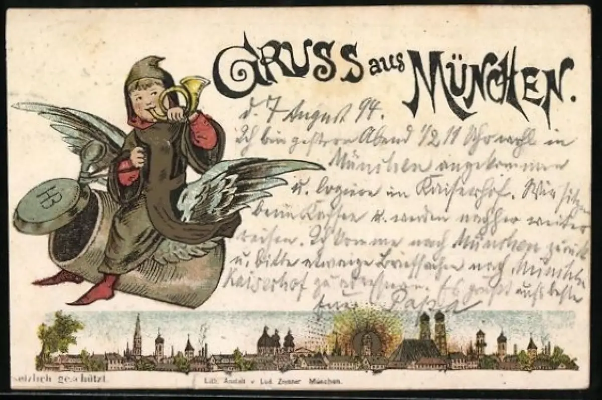 Vorläufer-AK München, 1894, Münchner Kindl fliegt auf einem Bierkrug über die Stadt