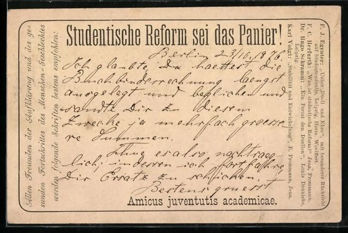 Vorläufer-AK Studentische Reform, 1876, Reklame Schriften von Hugo Schramm, Karl Voigt u. A., Ganzsache Frech unbekannt