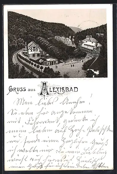 Vorläufer-Lithographie Alexisbad, 1895, Blick auf das Kurhotel mit Blick zum Ort