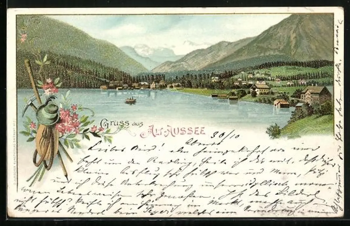 Vorläufer-Lithographie Altaussee, 1895, Blick zum Ort, Bergsteigerausrüstung